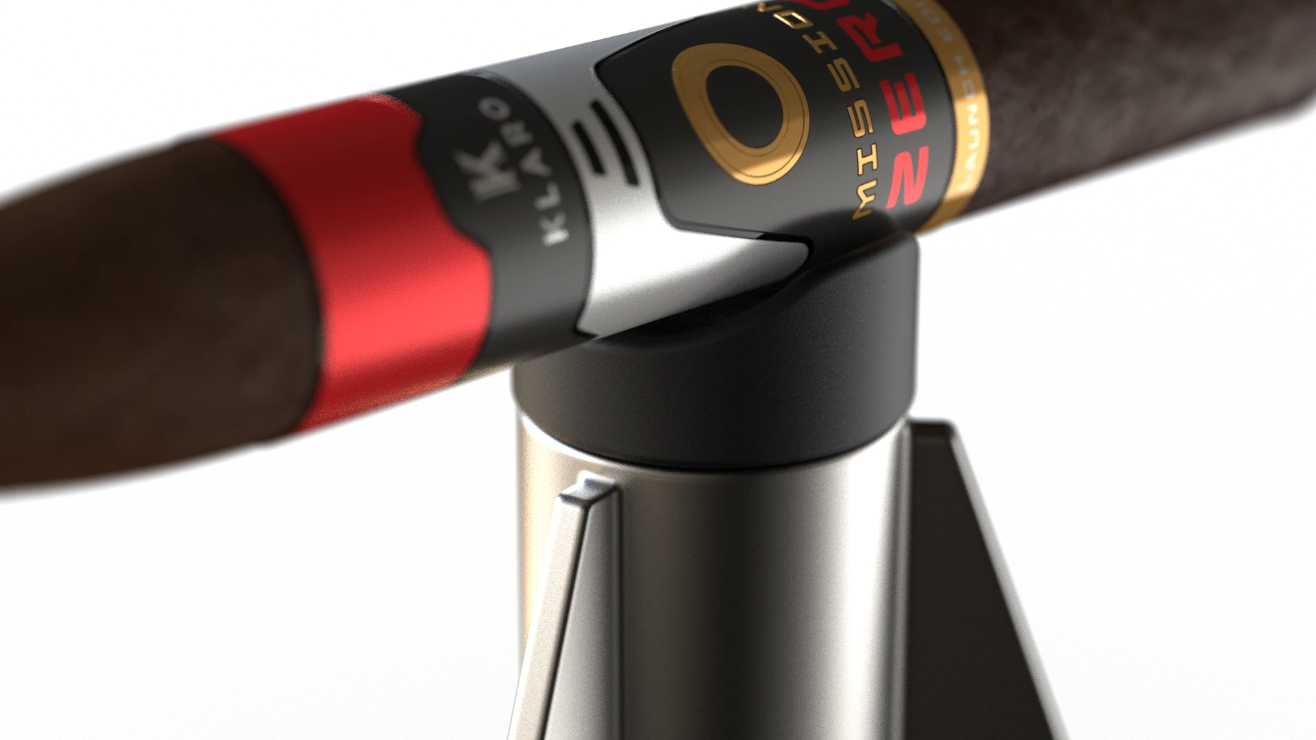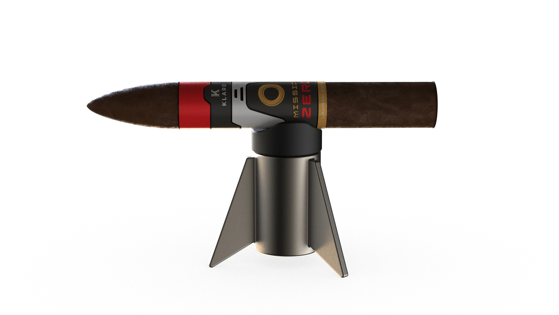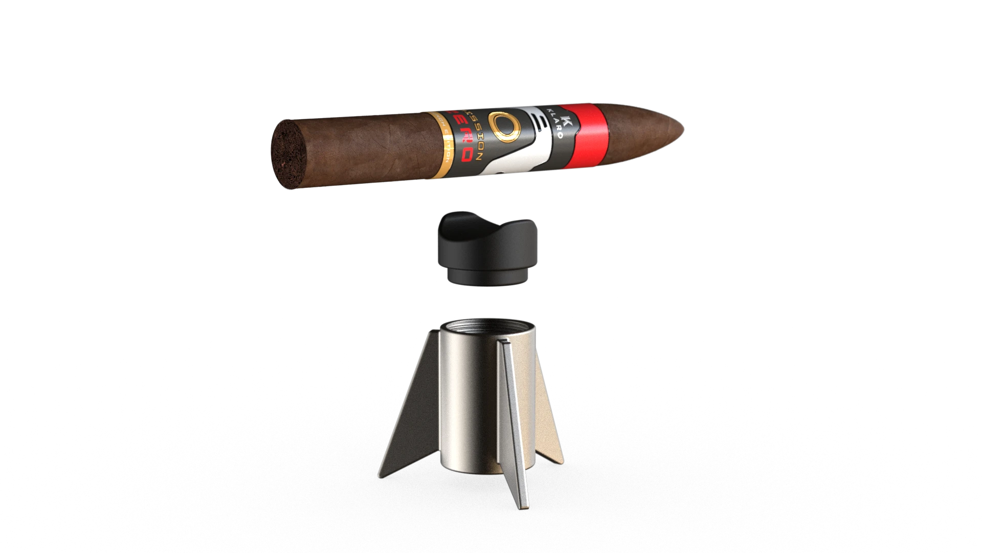 A rubber plug deploys into the base of the rocket tube, converting it into a stable stand that cradles the cigar during use.